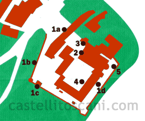 | 1.a Walls: external walls, now incorporated in the houses. 1.b Walls: Moat 1.c Walls: Tower 1.d Walls: curtain at defense of the Abbey Church 2. S.Salvatore e Cirino Church 3. Compagnia Laicale Chapel 4. Ancient Monastery 5. Panoramic view on Monteriggioni |