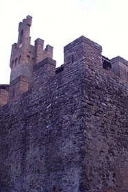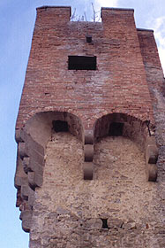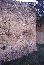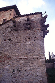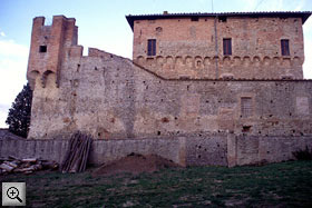 Two noble families of Siena, the Guiglieschis first and the Cacciacontis then, had held the castle since mid-13th century. The square keep instead was raised in the middle of the fortification in the fourteenth century. The castle was later destroyed, but rebuild in the fifteenth century by the new owner, the Cardinal Raffaello Petrucci, following a project of the architect Baldassarre Peruzzi. Bibbiano castle is made up of two structures, the keep and the double walled enclosure surrounded by the ditch, running on three of the four sides. On the west side of the walled curtain angles there were two crenelated leaning turrets endowed with machicolation, one is intact but the second is disapperared, only the brackets in stone that once supported it remains. The unique gatehouse is finely framed with sandstone ashlars and protected by a great number of arrowslits and loopholes. Facing the inner curtain is still visible the wall walk. The complex is, mainly for its still intact medieval aspect, one of most remarkable of the whole Sienese countryside. Today is private property visible only from the outside.