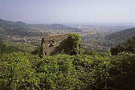 Foto e testi a cura del Prof.Renato Vita, Responsabile della biblioteca 'M.o.v.c. Giuseppe Taliercio' Il diruto Castello di Moneta sovrasta la frazione di Fossola a km. 3 da Carrara: � raggiungibile con l'autostrada A12 Ge-Li, uscendo al casello di Carrara. Risaliti in direzione Monti, a Fossola si imbocca via Moneta. Oltrepassato "Il Ciocco" dopo km.1 tra uliveti e vigneti si arriva al CastelloClicca qua per una planimetria dell'area di Moneta Sullo sfondo delle marmoree Apuane, il Castello di Moneta ancora domina, dall'alto del suo colle (300 m.slm.) la sponda destra del torrente Carrione, a guardia della "foce d'Ortonovo", passo collinare tra le prime vallate liguri e la valle di Carrara, incrocio delle antiche vie di valico, la preistorica "via del sale" per la Lunigiana e la medievale "via pedemontana" per la Liguria. Sito fortificato dei Liguri Apuani, uno sperone sottostante � "Il Castellaro", nel II sec. a.C. Moneta � un "fundum gentis Monetia" della colonia romana di Luni, poi trasformata in "castrum" nel VI sec. dai Bizantini. L'antichissima funzione militare di Moneta prosegue attraverso i secoli e i diversi dominatori fino al sec.XVIII. Poi, nel 1944, truppe tedesche edificano 2 bunker sotto il vecchio Castello per le stesse esigenze difensive della guerra bizantino-longobarda dopo 1300 anni! Il diruto Castello di Moneta sovrasta la frazione di Fossola, "erede di Moneta", a km. 3 da Carrara. Scheda storico - Tecnico - Artistica
