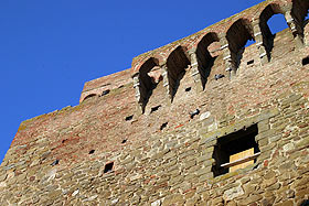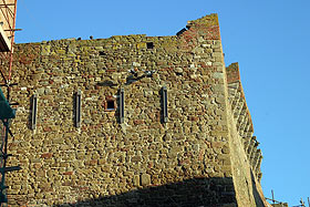 | Due particolari delle mura della Rocca con i resti dell'apparato difensivo a sporgere. | |