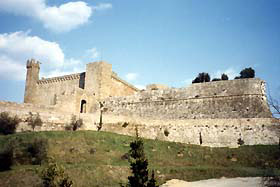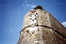 | The castle from outside the town walls. | The Medicean coat of arms at the point of the rampart. |