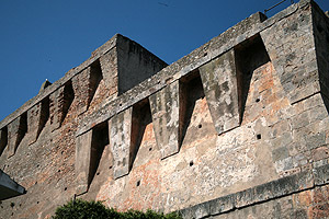 The fortress was constructed over a long period of time and only completed in 1636. Modifications were made after military engineer, Pedro Alvarez, carried out a later restorative project. Today, the complex has a quadrangular base, formed by two adjacent, staggered blocks (the shorter one facing the sea,) imposing, steep, sloping walls – some parts faced in stone, others in plaster – culminating in a crown of protruding supports holding up machicolations, towering above from the battlements. Several embrasures open at varying heights.