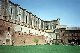 The hermitage began too small to contain the monks and the pilgrims, so in 1218 was decided to begin the construction of a new imposing Abbey in the plain below. The works were encouraged also by the Bishop of Volterra. The community of Saint Galgano began the point of reference for all the territory and for the interest of the Senese Republic. The Abbey was built in the classic gothic forms of all the other Cistercian constructions, with plan at Latin cross with three aisles, rich of carved capitals and rose-windows, cloister, halls, bell tower.