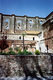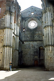 The richness of S.Galgano and the good relationships with Siena attracted on it the incursions of the Florentine armies that, together with other political events, carried to a rapid decadence of the abbey since from the first half of 15th century: in the 1550 only five monks were in the abbey and at the beginning of 17th century only one old and poor monk still lived between its walls, already in ruin. On the 6 of January 1786 the bell tower, with its 36 meters high, collapsed sweeping up great part of the roof of the church. In the 1789 the great Abbey was definitively abandoned and become an enormous quarry of stones and columns for all the buildings of the zone. Fortunately, from the beginning of this century, many jobs of restoration and maintenance have been undertaken, so that today the ruins of Saint Galgano, by now without more traces of the roof, are one of the most visited medieval monuments in Tuscany.