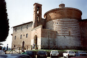 The abbey of Saint Galgano with the Montesiepi hermitage rise in the valley of the river Merse, between the medieval villages of Chiusdino and Monticiano, in the province of Siena. Both sites are easily reachable from Florence following the motorway FI-SI until the exit towards 'San Lorenzo a Merse', then following the indications for Monticiano. You can also exit the motorway at Siena and then drive on the road SS73 that leads to the ruins of Saint Galgano.The original nucleus of the monastic complex Cistercian of Saint Galgano (Galgano Guidotti 1148-1181) is constituted by the hermitage of Montesiepi, built in Roman style as mausoleum of the Saint between the 1182 and the 1185. Its greater particularity is the so-called 'the Rotunda of Saint Galgano' with a unique, for the constructions of that time, plan. It encloses, beyond to the tomb of the saint, the famous rock with the sword. Although at a first look it can seem an emulation of ancient Etruscan tombs of Populonia, Vetulonia and Volterra, the architect responsible of its construction inspired itself to Castel S.Angelo and the Pantheon of Rome. In the following centuries the Rotunda was strongly manumitted, but the perfect restoration of the year 1924 brought it back to the original aspect. The dome is constructed using alternated rows of white stone and bricks. With the growth of the interest in the cult of Saint Galgano many rich nobles wanted to contribute to the embellishment of the Rotunda, in the year 1340 was begun the construction of a Chapel on the north side, then frescoed by the great artist Ambrogio Lorenzetti, he's paintings are still today in part visible thanks to a careful restoration work that has arrested their degrade.