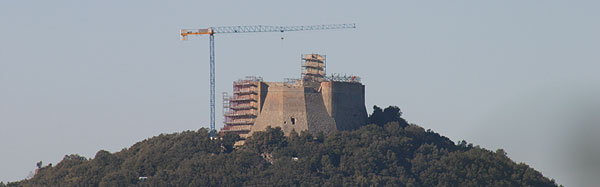 Reached the the top of the hill we find us under the thick bastionated walls of the fortress. Particular are the four leaning turrets built on the corners of the enclosure and the high curvature of the curtain. The lower parts of the walls are built in stone, the upper in bricks. Over all stand the ancient nucleus of the fortress: a square shaped stone watch tower, with the gate of access sited at the level of the first floor, now walled but still well visible. Once climbed on the bastions we can easily understand the strategic importance of the Rocca and enjoy a wonderful sightseeing: in the days of clear weather the bird-eye view can space up from here to the sea. The fortification remained abandoned for centuries. Before the reopening of 18 April 2009, after years of works and excavations, the inner courtyard was invaded by the vegetation and the floor results notably high due to sediment deposits. In 1985 started the archeological excavations. In the following years the works of restoration bring to the light the internal halls, once used as stores and barracks for the garrison, some ovens and other buildings, also of the village. In July 2001 the Rocca was endowed with an important system of illumination for the night. Today the complex is again freely visible to the public, each Saturday and Sunday from 3,30 to 6,30 p.m.